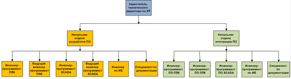 Анализ организационной структуры показывает ее соответствие линейному типу, в рамках которого подчинённость участников организационной системы можно представить в виде дерева, в котором каждый элемент подчинён следующему более высокого уровня. Данная структура отражает статические характеристики организационной системы. В некоторые моменты времени для организации характерна смена структуры, при которой возможна трансформация из линейной в матричную, с организацией двойного подчинения и дополнительных связей между любыми элементами для решения организационной системой специфичных задач. С точки зрения целей и решения задач указанная структура соответствует функциональному типу, в котором декомпозиция строится на основе функций – разработки ПО ПЛК, разработки ПО SCADA, настройки информационной безопасности и др. [3, стр. 373].