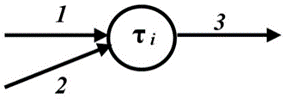 б) Вторая часть графа (рис.1) содержит вершины TRi (i=1,…,N), смысл мощностей которых есть трудоемкости соответствующих ФП. Формальные правила TRi-вершины с инцидентными ей дугами (рис.4) представлены в табл. 3, вид потока в дуге 2 − на рис.3,b. Смысл параметра этого потока – «скорость изготовления» продукции (производительность ресурсов), выпускаемой конкретной ФП в промежутке времени [0,τ].