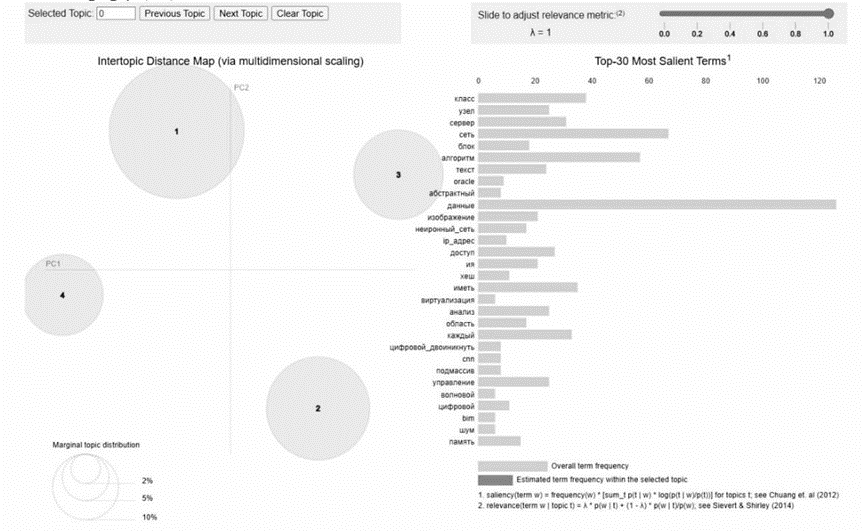 После тематического моделирования навыков с помощью латентного преобразования Дирихле следует выявлять «ядерные» компетенции и компетенции второго и третьего порядка. В вычислениях метода лежит «заметность» выделенного и искомого слова, которая является частотой термина в корпусе текстов (термин тем заметнее, чем чаще встречается во всем корпусе), и релевантностью, или уместностью, принадлежности к тому или иному кластеру (рассчитывается частота употребления термина в конкретном кластере). Карта, визуализирующая выявленные кластеры, представленная на рис. 1, иллюстрирует хороший пример кластеризации, так как они расположены во всех четвертях и не пересекаются.